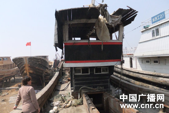 漁船冀昌漁5056號左側船舷全部被撞壞(中國之聲記者陳俊杰/攝)