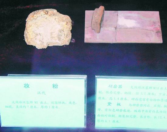 ????王館長還介紹說,在大鬧埠考古發(fā)掘中,他們還發(fā)掘出了化妝粉、研磨器和黛板,這是一套化妝用品,通常女子將化妝粉倒在黛板上,然后用研磨器在黛板上磨,化妝粉磨細后就可以涂抹在面部上了,這一套化妝品和大量銅鏡的出土,可以反映出西漢時期的女子非常愛美容也愛化妝。