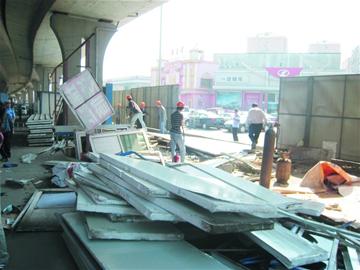 ????昨天上午,施工人員首先拆除了橋下兩側(cè)的圍擋及部分容易拆裝的活動(dòng)板房,兩側(cè)的圍擋拆除后,橋下立馬顯得格外敞亮。執(zhí)法人員告訴記者,橋下共有56家經(jīng)營(yíng)業(yè)戶,經(jīng)營(yíng)范圍包括了洗車美容、汽車修理、鐵藝及塑鋼加工、五金土產(chǎn)、稱重等,自半個(gè)多月前,他們已經(jīng)向承包人發(fā)出了整治通知,之后又挨家挨戶通知了業(yè)主,張貼了通告,并將首次集中清理時(shí)間定在昨天,預(yù)計(jì)整個(gè)整治行動(dòng)共分3次。對(duì)空地清理后的用途,執(zhí)法人員表示,最終方案還沒(méi)有確定,但首選仍是在硬化、綠化后,重新建設(shè)停車場(chǎng),解決周邊停車難題。