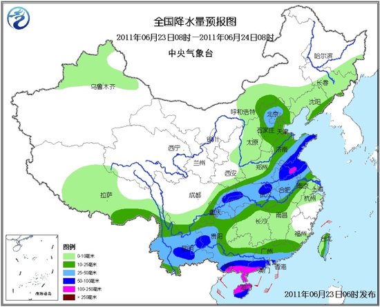 中央氣象臺6月23日06時繼續發布暴雨藍色預警: