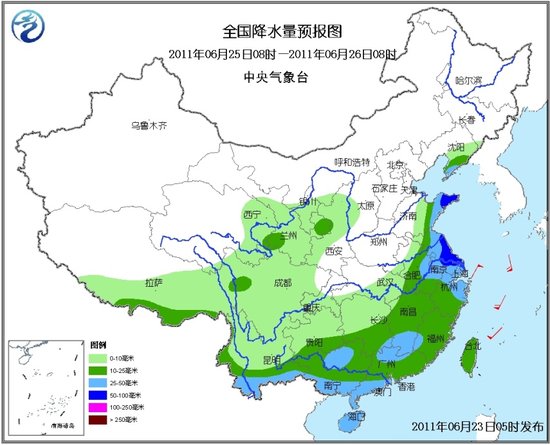 ????23-25日,西南地區東部、江漢、黃淮、江淮、江南北部等地有大雨或暴雨,其中,蘇皖北部局地有大暴雨。23日白天到夜間,北京和河北北部的部分地區有大雨。