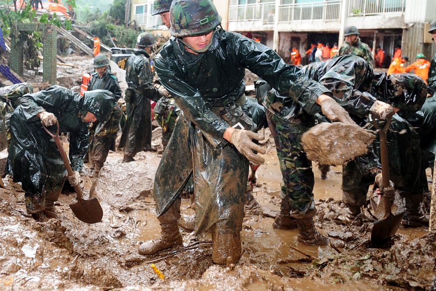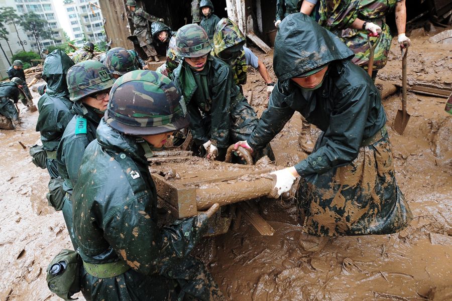 韓國《中央日報》28日稱,遭遇泥石流的牛眠山居民怨聲載道,指責政府拖沓山上工程的工期致泥土堆積,之前提意見督促雨季前完工,政府不予理睬,直至慘禍發生。圖為災后展開清理工作。