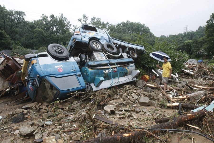 圖為當地時間7月27日,韓國首爾遭到暴雨襲擊,城市街道被淹,部分地區引發泥石流災害。