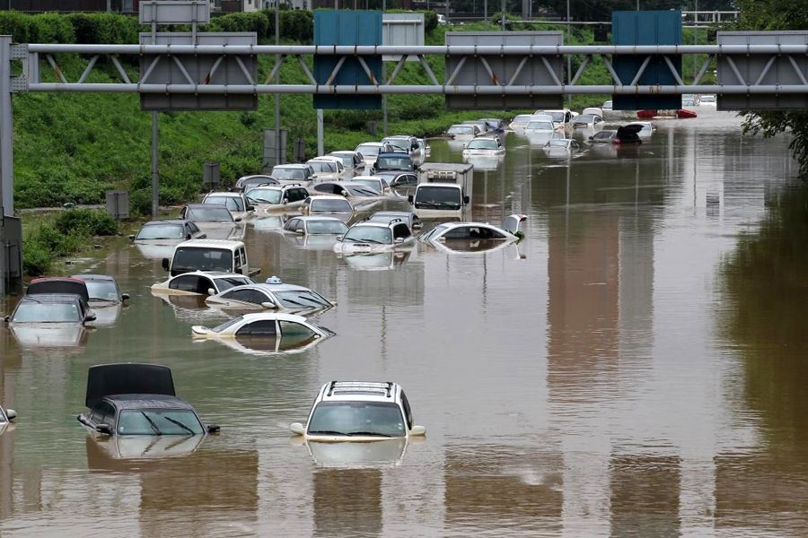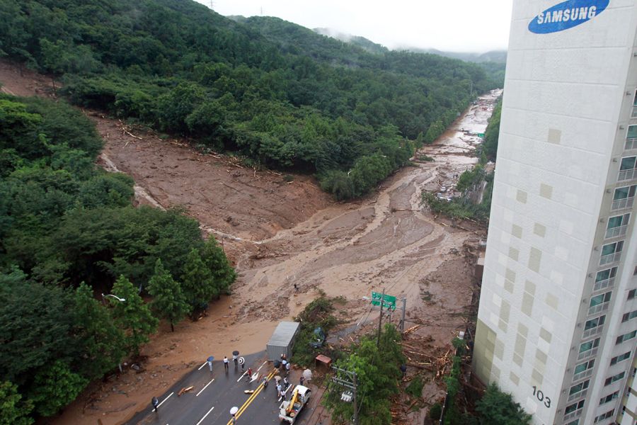 圖為當(dāng)?shù)貢r(shí)間7月27日,韓國(guó)首爾遭到暴雨襲擊,城市街道被淹,爾瑞草區(qū)的牛眠山出現(xiàn)山體滑坡,造成15人死亡、2人失蹤,這是首爾市在最近10年來(lái)首次發(fā)生死亡人數(shù)達(dá)到兩位數(shù)的大型水災(zāi)。