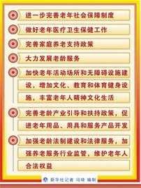 會議確定了“十二五”時期老齡事業發展的重點任務:(一)進一步完善老年社會保障制度。實現新型農村社會養老保險和城鎮居民社會養老保險制度全覆蓋。將符合條件的老年人全部納入最低生活保障范圍。(二)做好老年醫療衛生保健工作。基層醫療衛生機構要為轄區內65歲以上老年人建立健康檔案,組織定期體檢。廣泛開展老年健康教育,更加注重老年精神關懷和心理慰藉。(三)完善家庭養老支持政策。完善老年人口戶籍遷移管理政策、家庭養老保障和照料服務扶持政策,提倡親情互助,弘揚孝親敬老傳統美德。(四)大力發展老齡服務。居家養老服務網絡覆蓋所有的城市街道、社區和80%以上的鄉鎮、50%以上的農村社區。推進供養型、養護型、醫護型養老機構建設,實現每千名老年人擁有30張養老床位。開展多種形式的老年社區照料服務,加快發展護理康復服務。(五)加快老年活動場所和無障礙設施建設,增加文化、教育和體育健身設施,豐富老年人精神文化生活。(六)完善老齡產業引導和扶持政策,促進老年用品、用具和服務產品開發。(七)加強老齡法制建設和法律服務,加強養老服務行業監管,維護老年人合法權益。會議要求各地區、各有關部門加強組織領導和督促檢查,確保規劃順利實施。