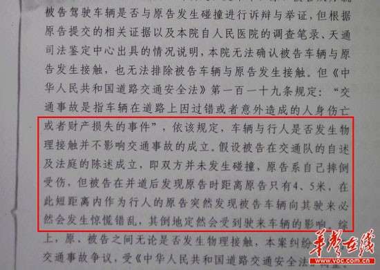 法院判決的理由是,“不能確定小客車與王老太身體有接觸,也不能排除小客車與王老太沒有接觸。被告發現原告時只有4、5米,在此短距離內作為行人的原告突然發現車輛向其駛來,必然會發生驚慌錯亂,其倒地定然會受到駛來車輛的影響。”