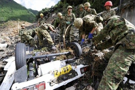 日本自衛隊員將埋在泥沙中的車輛挖出以尋找失蹤人員。6日上午9時08分攝于奈良縣五條市大塔町宇井地區。(共同社)