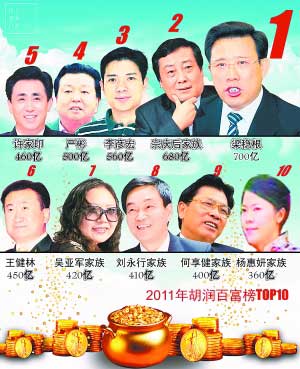 本報(bào)訊 (記者 王劉芳)高房?jī)r(jià)在造就千萬(wàn)“房奴”的同時(shí),也造就了大批富豪。昨天胡潤(rùn)研究院發(fā)布了新一期的中國(guó)富豪榜。這張榜單顯示,在排名前50位的頂級(jí)富豪中,有27位涉及房地產(chǎn)業(yè)務(wù);在排名前10位的巨富中,有5位涉及房地產(chǎn);在排名前1000位的富豪中,有23.5%涉及房地產(chǎn)。