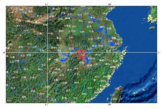 中新網9月10日電 據中國地震臺網測定,北京時間2011年9月10日23時20分在江西省九江市瑞昌市、湖北省黃石市陽新縣交界地區(北緯29.7,東經115.4)發生4.6級地震, 震源深度17公里。武漢、南昌等地均有震感。