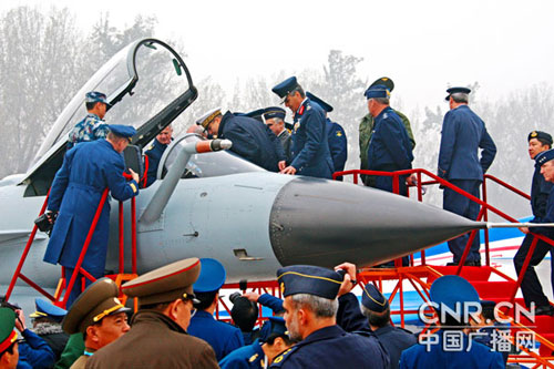 2009年11月,大批外國軍官集體參觀殲-10戰(zhàn)斗機。(中廣網(wǎng)圖片)