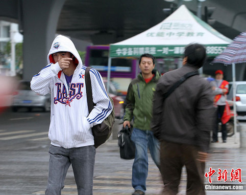 9月19日,武漢大街小巷過往行人紛紛穿上御寒外套,應對低溫天氣。從昨日起,呼嘯的5級北風讓江城氣溫一路猛跌至12℃左右。中新社發 張暢 攝