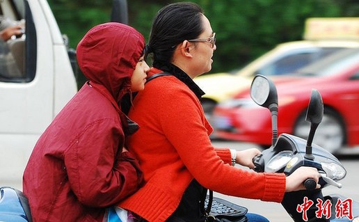 在江西九江市街頭,市民穿上秋衣在寒風中出行。隨著較強冷空氣不斷南下,從9月18日開始,中國南方大部地區氣溫出現大幅下降,四川、湖南、江西等多省累積降幅將超10℃,局地達15℃左右。此次大幅降溫或導致江南中北部出現寒露風,這對近期正處抽穗揚花期的晚稻產生不利影響。據了解,此次冷空氣的影響會一直持續到22日。