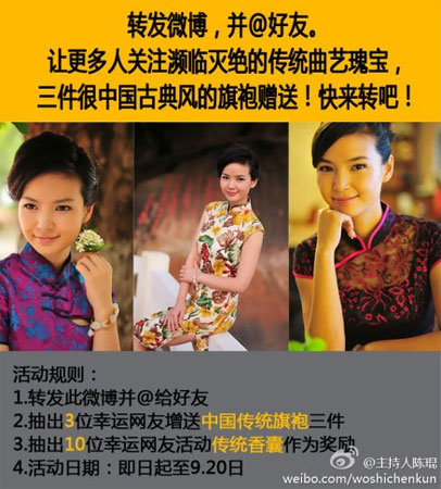 ????一則“拯救傳統(tǒng)曲藝”的微博,在短短兩天內(nèi)引起近萬網(wǎng)友的支持。 ????9月13日,河南衛(wèi)視《華豫之門》美女主持陳琨在個(gè)人微博上發(fā)起了#轉(zhuǎn)微博、救曲藝、送旗袍#活動(dòng)。陳琨在微博上寫道:中國戲曲394個(gè)劇種現(xiàn)今僅存260余個(gè),且很多遭遇傳承斷代、無人繼承的境地,曲藝之鄉(xiāng)河南,便有60余劇種瀕臨滅絕。你的一次轉(zhuǎn)發(fā),便能喚起更多人對(duì)傳統(tǒng)曲藝的關(guān)注,呼吁拯救曲藝瑰寶,我將以大愛的三