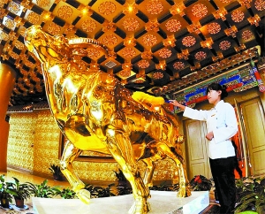 在江蘇華西村龍希國際大酒店60層,工作人員正在為“鎮樓之寶”號稱“價值3億元人民幣”的金牛做保潔。據華西村老書記吳仁寶介紹,這頭一噸重的金牛從入庫到現在已增值三成。龍希國際大酒店大樓共74層,與北京國貿三期高度一樣,已成為華西村新的地標性建筑。