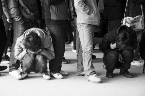 昨天,上海站春運大賣場,排隊長龍中,兩名旅客蹲著小睡等候售票窗口開放。