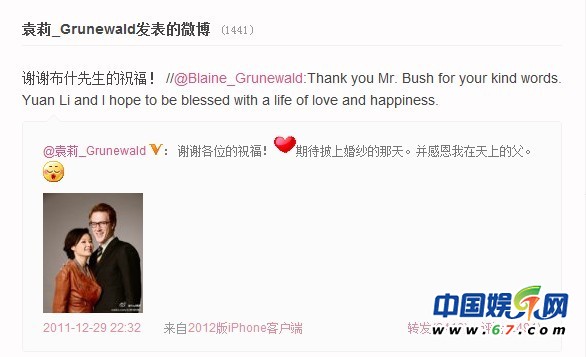 近日,突然閃電結(jié)婚的袁莉收到了來(lái)自美國(guó)前總統(tǒng)的祝賀,在微博上,袁莉高調(diào)感謝來(lái)自布什總統(tǒng)的祝賀。并表示期待穿上婚紗,舉辦婚禮的時(shí)刻。