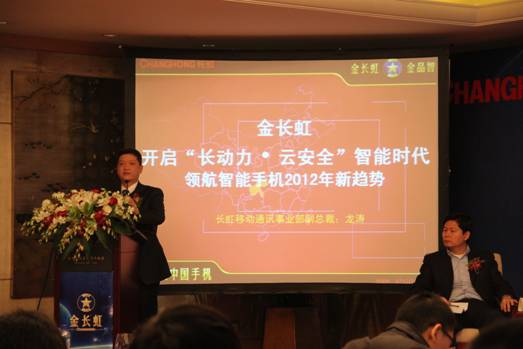 2012年1月5日,長虹集團在北京萬達索菲特大飯店召開了以“2012智能手機新趨勢——長動力·云安全”為主題的新聞發布會。 當天,長虹集團規劃與技術戰略部部長陳曄、長虹集團企業策劃部部長兼新聞發言人劉海中、長虹移動通訊事業部副總裁龍濤、長虹移動通訊事業部CTO/長動力研究院院長周建國、長虹移動通訊事業部重慶基地COO/云安全研究所所長何從華等長虹公司領導悉數高調出席發布會,共同見證“2012年智能手機新趨勢——長動力·云安全”發布會。同時,中國泰爾實驗室總工程師史德年、聯發科技(MTK)中國區首席代表呂向正、奇虎360首席營銷官許四清等戰略合作伙伴的高層領導、專家人士也出席了此次發布會。 在此次發布會上長虹集團高調發布其智能手機新戰略和全新的智能移動終端品牌“金長虹”;并同時發布三大系列新品:動力王系列、虹Phone系列、金長虹1958系列,擬在2012年掀起以“長動力·云安全”為主題的品牌運動。