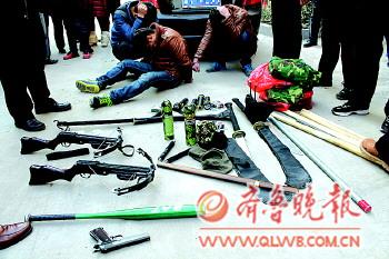 民警查獲的兇器總數超過20件。邢志彬攝 5日下午,泰安警方在一小區(qū)查處三輛可疑車輛,搜出氣手槍、弩、關公大刀等兇器二十多件,目前車上8人均已被控制。 5日下午3時,泰安市泰山區(qū)公安分局刑警隊的民警朱峰在下河橋附近發(fā)現一輛白色奇瑞轎車上人員表情慌張,十分可疑,便跟蹤該車。該車剛駛入元寶小區(qū),民警就截住其退路,對車內進行搜查,搜出匕首、四根木棍、一根鐵棍和遮車牌的布套等物品。 根據平時的辦案經驗,朱峰懷疑這伙人還有同伙正向此處趕來,于是繼續(xù)緊盯每一輛出入小區(qū)的車。民警很快又發(fā)現一輛黑色越野車和一輛黑色轎車趕來,民警趁他們還沒反應過來,迅速將車上人員制服。三輛車上共搜出一把氣手槍、兩罐氣手槍用的燃氣、三把關公大刀,每把刀都接近一米長。還有兩把弩、幾包鋼珠、戰(zhàn)術手電、對講機、迷彩服和多把匕首甩棍。兇器總數達20余件。 據初步審訊,這伙人都來自泰安,因為朋友前不久被人傷害便前來尋仇。他們剛到元寶小區(qū)集合,就被警察發(fā)現并制服。其中五人被依法刑事拘留。 |