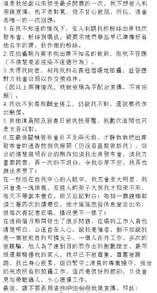 宣萱所發聲明截圖 近日有媒體報道宣萱缺席《祥子的故事》關機宴,稱其和劇組鬧不和,并借機耍大牌。1月10日晚,宣萱針對此事發聲明,宣萱在聲明中駁斥劇組各種不妥行徑,其中包括要求她“出席不知名的飯局”、不按時支付尾期酬金等等。宣萱憤怒稱這是她拍劇以來發生最多問題的一次。 以下是聲明全文: 這是我拍劇以來發生最多問題的一次,我不想被人利用做宣傳,也不是對罵,但不甘心被屈,所以,這會是唯一的一次響應: 1.在我不知道的情況下,有人利誘我的粉絲出席初次發布會,粉絲到場后,硬要求她們舉起早已準備好有他名字的牌,扮作他的粉絲。 2.在拍攝期內要求我出席不知名的飯局,但我不答應(不清楚是否渲染不道德行為)。 3.未得我同意,利用我的名義租借場地拍攝,并答應對方我會合照以作交換條件。 (因以上兩種情況,我就被稱為不配合宣傳,不肯拍照)。 4.我收不到尾期酬金停工,仍說我不對,還說要我作出賠償。5.其他演員問及殺青日就爽快答覆,我數次追問也只是支吾以對。 6.在最后關機發布會日不足兩天前,才靜悄悄把出席發布會的通告放到我房間(仍沒有直接告訴我),但合約清楚寫明在合約期內如須我出席發布會,須我方書面同意,再一次的不坦白,令我非常不安,我再也無法承受了! 在一些活在自我中心的人眼中,我怎會是大明星,我只會是一塊綠葉,有些人的架子大到我才招架不來,每天不帶劇本埋位,但又忘記對白!每拍一個鏡頭都須三番四次的請埋位,他才施施然從休息室走出來!但每次有記者在場,情況便不一樣了! 在這兩個月期間發生了很多問題,在場的工作人員也清楚明白,公道自在人心。說我是強者,倒不如說我是一個被欺負的可憐女子,一個人在外工作,多次的被瞞騙、他人為了達到目的而作出的無數謊言,最可恨還要騷擾我的家人,我早已不被尊重,尊嚴被踐踏,我已身心疲累,但仍緊守演員的專業操守,按合約完成所有的拍攝工作,這次是很好的教訓,日后會更加帶眼識人,小心選擇工作。 最后,請不要再用這些手法利用我做宣傳,拜托! |