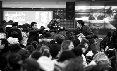 ????一名男子在人群中抱起孩子傳給同伴。昨日,北京西站候車室,旅客準備進站。本報記者 周崗峰 攝