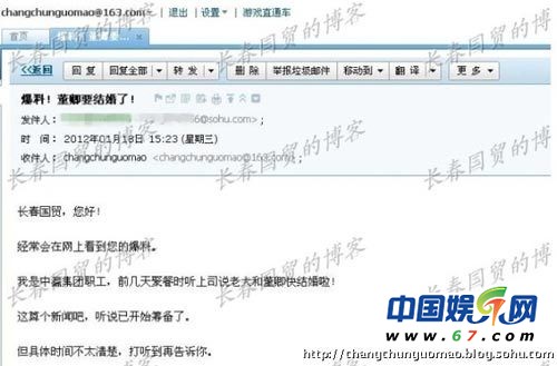 近日,在長春國貿的郵箱里收到一封陌生人郵件,發件人稱自己為上海中瀛集團的員工,在郵件中向長春國貿爆料:前幾天聚餐時聽上司說老大要和董卿結婚啦!聽說已經開始籌備了,具體時間還不太清楚。很簡單的一段話,傳出了央視一姐董卿的喜訊,這里所說的“老大”指的自然是曾多次被拍到與董卿在一起約會的中瀛集團董事長密春雷了。