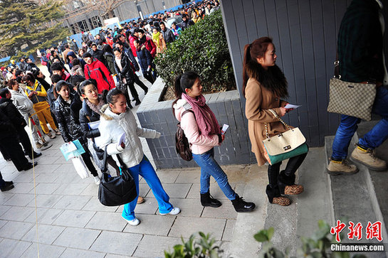 2月12日上午,2012北京電影學院藝考文學系、導演系、攝影學院開始初試,表演學院則開始了為期13天初試、復試和三試的藝考“長跑”。圖為考生排隊等待入考場初試。