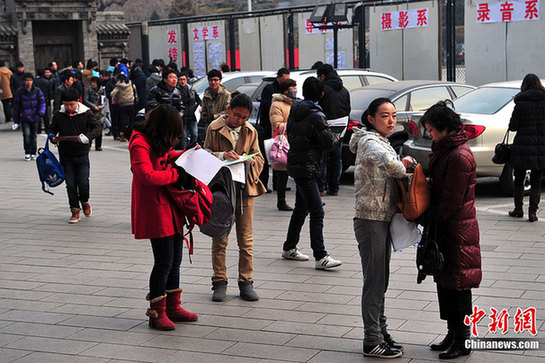 2月12日上午,2012北京電影學院藝考文學系、導演系、攝影學院開始初試,表演學院則開始了為期13天初試、復試和三試的藝考“長跑”。圖為考生準備進入考場初試。