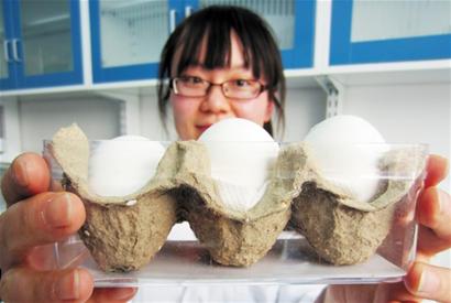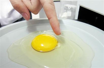 ????“雞蛋黃嚼起來(lái)特別有韌性,不松散,比我之前吃的雞蛋口感差很多”,前幾日市民張女士給孩子熟雞蛋吃,發(fā)現(xiàn)雞蛋有些問(wèn)題,不僅有彈性,而且味道也有些異樣?!半y道自己買到了之前媒體曾報(bào)道過(guò)的假雞蛋? ”她向記者反映了自己的擔(dān)心。為了一驗(yàn)雞蛋真假,記者和市畜牧獸醫(yī)局工作人員帶著疑似假雞蛋來(lái)到了北京農(nóng)業(yè)部家禽品質(zhì)監(jiān)督檢驗(yàn)測(cè)試中心。經(jīng)過(guò)檢測(cè)人員測(cè)定發(fā)現(xiàn),疑似雞蛋均為真蛋,之所以出現(xiàn)上述癥狀,主要是因?yàn)榈蜏睾捅4鏁r(shí)間過(guò)長(zhǎng)所致。 ????問(wèn)題雞蛋送到北京檢測(cè) ????張女士說(shuō),當(dāng)把蛋黃單獨(dú)拿出來(lái)時(shí),蛋黃竟然跟橡皮球一樣,50厘米的高度扔下,蛋黃彈起了15厘米高左右,而且繼續(xù)反彈了幾次。 ????記者帶著“問(wèn)題蛋”首先咨詢了青島市畜牧獸醫(yī)局,對(duì)于雞蛋的真?zhèn)蜗胱鰝€(gè)檢測(cè),市畜牧獸醫(yī)局聯(lián)系了位于北京的能夠檢測(cè)雞蛋品質(zhì)的農(nóng)業(yè)部家禽品質(zhì)監(jiān)督檢驗(yàn)測(cè)試中心。昨天,記者帶著市民提供的三枚疑似假雞蛋與畜牧獸醫(yī)局工作人員一起,來(lái)到位于隸屬于中國(guó)農(nóng)業(yè)大學(xué)的農(nóng)業(yè)部家禽品質(zhì)監(jiān)督檢驗(yàn)測(cè)試中心。,聽(tīng)說(shuō)記者帶來(lái)了幾枚疑似假雞蛋,檢測(cè)人員都十分熱切想看看假雞蛋到底啥樣。 ????“上海、廣州、陜西等全國(guó)不少地區(qū)經(jīng)常有人向我們反映在市場(chǎng)上見(jiàn)到了假雞蛋,但能拿到實(shí)驗(yàn)室進(jìn)行檢測(cè)的幾乎沒(méi)有。 ”檢測(cè)人員告訴記者,由于雞蛋本身結(jié)構(gòu)十分復(fù)雜,其中一些部分難以通過(guò)人工假冒,所以通過(guò)感官和物理指標(biāo)就能判斷雞蛋真假。說(shuō)著檢測(cè)人員首先將三枚雞蛋進(jìn)行標(biāo)號(hào),之后用一個(gè)類似于手電筒的光照儀器對(duì)準(zhǔn)三枚雞蛋的頂端,頂端顯現(xiàn)出空隙,其中1號(hào)雞蛋的空隙較小,任憑怎么晃,空隙范圍沒(méi)有變化,但2號(hào)和3號(hào)雞蛋的空隙直徑較大,而且范圍不穩(wěn)定。 ????“這些空隙叫做氣室,是判定雞蛋是否新鮮的標(biāo)準(zhǔn)之一??障斗秶环€(wěn)定說(shuō)明雞蛋存儲(chǔ)的時(shí)間較長(zhǎng)了。 ”接著實(shí)驗(yàn)人員又開始進(jìn)行第二步判定,將三枚雞蛋放在儀器下進(jìn)行蛋殼強(qiáng)度、蛋黃質(zhì)量、蛋殼重量的測(cè)定,得出的數(shù)據(jù)均在國(guó)家正常雞蛋的標(biāo)準(zhǔn)范圍之內(nèi)。 ????經(jīng)檢測(cè)三只雞蛋均為真蛋 ????對(duì)雞蛋的外形進(jìn)行檢測(cè)后,檢測(cè)人員又開始對(duì)判斷雞蛋真假的幾個(gè)關(guān)鍵部位進(jìn)行檢測(cè)。首先檢測(cè)人員將三枚雞蛋剝開后,在蛋殼皮與雞蛋白之間都發(fā)現(xiàn)了蛋殼膜。 “一般來(lái)說(shuō)雞蛋都有兩層蛋殼膜,而假雞蛋很難制作出殼膜,即使做出了,而且和真雞蛋類似,成本也會(huì)大大提高。 ”接著檢測(cè)人員將1號(hào)雞蛋打開后完整的盛放在儀器中,記者看到雞蛋清共分為兩層,其中一層較稀,一層較濃,檢測(cè)人員用小刀將較濃的蛋清輕輕劃開,兩層蛋清中又滲出了另外一層。 “兩層蛋清分別為稀蛋白、濃蛋白,最后滲出的則為內(nèi)稀蛋白,這是正常的性狀。 ” ????蛋白“合格”后,檢測(cè)人員又開始觀察蛋黃。記者看到蛋黃上有一個(gè)白色的小點(diǎn),在蛋黃周圍還有一條白色的細(xì)帶。 “小點(diǎn)是胚珠,細(xì)帶則是系帶,就像人體的‘臍帶’一樣。從這里看這枚雞蛋是完整的,而且是真雞蛋。 ”檢測(cè)人員說(shuō)。 ????最后檢測(cè)人員又將檢測(cè)目標(biāo)轉(zhuǎn)移到蛋殼上,取下一片蛋殼并剝除了里面的內(nèi)膜,接著用一種藍(lán)色的美蘭試劑在蛋殼內(nèi)壁涂抹了幾層,之后內(nèi)壁的藍(lán)色滲透到了外壁上,而且透過(guò)染色的蛋殼,能明顯看出蛋殼表面分布不均的小氣孔。 “如果是假雞蛋,很難造出氣孔,即使造出氣孔,那這些氣孔也是分布均勻的。 ”檢測(cè)人員說(shuō),“通過(guò)上述幾項(xiàng)測(cè)試,就已經(jīng)能夠判定這枚雞蛋是真的。 ”接著檢測(cè)人員對(duì)其余的兩枚雞蛋都做了同樣的實(shí)驗(yàn),得出的結(jié)果和第一枚一樣,三枚雞蛋均為真雞蛋。 ????兩大原因?qū)е码u蛋蹦高 ????為什么總會(huì)出現(xiàn)“橡皮蛋”的情況?難道就是假雞蛋嗎?對(duì)此農(nóng)大徐桂云教授說(shuō),雞蛋儲(chǔ)存的環(huán)境對(duì)蛋清及蛋黃的彈性影響較大。 “一般關(guān)于假雞蛋的事件都是出現(xiàn)在冬天,而且以盛放在禮盒中的雞蛋居多,這些雞蛋由于長(zhǎng)時(shí)間擺放在室外展賣,賣不完就又放回室內(nèi),多次的氣溫變化對(duì)蛋黃會(huì)有一定的影響。 ” ????記者在實(shí)驗(yàn)室看到了一枚冷凍了約20小時(shí)的雞蛋,檢測(cè)人員將雞蛋打碎后整個(gè)蛋黃呈現(xiàn)球狀,并非像正常雞蛋一樣平鋪在平面上,而且記者嘗試按壓一下雞蛋,發(fā)現(xiàn)蛋黃十分有彈性。 “正常雞蛋的話一碰蛋黃,整個(gè)就散了。生雞蛋都這么有彈性,煮熟之后肯定也有彈性。出現(xiàn)彈性可能是因?yàn)榈鞍鬃冃裕唧w是哪種蛋白我們也將進(jìn)一步進(jìn)