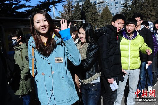 2月17日上午,北京電影學院表演學院發布2012年本科招生復試榜單。據悉,今年有6186人報考表演學院,進入復試階段的一共有1356人,最終錄取人數為85人。圖為考生排隊等候看榜。(中新社記者李學仕 攝)