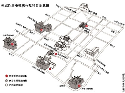 復(fù)建后的永定門。本報(bào)記者 李飛 攝 本報(bào)訊 左安門角樓、右安門角樓等這些建國(guó)后被拆毀的城樓舊址,將按照原來(lái)的建筑形制,建起新的標(biāo)志性建筑,讓人們能在地理上對(duì)于北京原有的“凸”字形城廓,形成一定的直觀感知。作為建國(guó)以來(lái)北京最大規(guī)模的“名城標(biāo)志性歷史建筑恢復(fù)工程,北京市準(zhǔn)備在6個(gè)地點(diǎn),實(shí)施歷史文化名城標(biāo)志性景觀的恢復(fù)。 城樓、角樓建國(guó)后拆除殆盡 這6處標(biāo)志性景觀分別為:北京外城西南角樓、永定門箭樓及甕城、北京外城東南角樓、天橋地表標(biāo)志、內(nèi)城西南角樓、地安門雁翅樓。 城墻和城樓是北京城最顯眼的標(biāo)志,但在建國(guó)之后,它們中的大部分,因交通等方面的需要,均遭到了毀滅性的拆除,造成歷史遺憾。 時(shí)至今日,位于建國(guó)門南大街和崇文門東大街相交處內(nèi)側(cè)的東南角樓,是唯一保存下來(lái)的北京城的角樓。它處在北京站東南殘留的一段城墻末端,現(xiàn)存角樓建成于明正統(tǒng)四年(1439),此后歷代均有修繕。 6大標(biāo)志性歷史建筑將重現(xiàn) 經(jīng)元、明、清數(shù)百年建設(shè)發(fā)展而形成的北京古都,最突出的歷史文化價(jià)值和城市建筑藝術(shù)魅力,主要體現(xiàn)在城市的獨(dú)特規(guī)劃、整體格局、傳統(tǒng)空間和保存至今的重要?dú)v史建筑群上。 按照《北京歷史文化名城保護(hù)規(guī)劃》要求,必須從整體上考慮北京舊城的保護(hù),具體體現(xiàn)在歷史河湖水系、傳統(tǒng)中軸線、皇城、舊城“凸”字形城廓、道路及街巷胡同、建筑高度、城市景觀線、街道對(duì)景、建筑色彩、古樹名木十個(gè)層面的內(nèi)容。 北京市文物局介紹,北京市政府及東、西城政府將組織實(shí)施歷史文化名城標(biāo)志性景觀的恢復(fù),保持明、清北京城“凸”字形城廓平面,保護(hù)好以現(xiàn)狀護(hù)城河為標(biāo)志的外城輪廓及城墻走向,進(jìn)一步保護(hù)和恢復(fù)北京古都的整體形象和傳統(tǒng)城市結(jié)構(gòu)。 并非所有標(biāo)志性建筑都能恢復(fù) 北京擬定建設(shè)的古城地標(biāo)共有6處,從周邊環(huán)境的建設(shè)難度考慮,預(yù)計(jì)最早建成的將是位于左安門的外城東南角樓。6個(gè)地標(biāo)建筑,分別位于右安門、永定門、左安門、天橋、西便門和地安門。建設(shè)難度也各有不同。由于建設(shè)將選址在舊址,而舊址周邊在幾十年的城市發(fā)展中已經(jīng)發(fā)生巨大變化,因此建設(shè)并不容易。有的舊址周邊目前已經(jīng)建成了鐵路,距離舊址僅有幾十米之遙。也有的地方雖然現(xiàn)在是綠地,但也要與有關(guān)部門進(jìn)行協(xié)調(diào)。相比較而言,目前位于左安門附近的外城東南角樓的恢復(fù)難度相對(duì)較低,預(yù)計(jì)可以最早開工。 市文物局表示,再現(xiàn)城市輪廓,也要在交通和市政的允許下進(jìn)行,因此并不是所有的標(biāo)志性建筑都能恢復(fù)。另外,類似天橋地表的標(biāo)志,未來(lái)計(jì)劃是把仍存的天橋的橋基進(jìn)行展示,具體的展示方式也在研討中。 專家 “恢復(fù)的是標(biāo)志,不是文物” 文物專家謝辰生表示已毀壞文物無(wú)法恢復(fù) 對(duì)于此次北京市的“名城標(biāo)志性歷史建筑恢復(fù)工程”,著名文物專家謝辰生表示,按照文物法的要求,不可移動(dòng)文物已經(jīng)全部毀壞的,應(yīng)當(dāng)實(shí)施遺址保護(hù),不得在原址重建。但目前如果將其作為一個(gè)新建的標(biāo)志也可以,但必須明確其不是文物。 謝辰生先生說(shuō),標(biāo)志性恢復(fù),首先就不是文物,原來(lái)的文物已經(jīng)不存在了,這是肯定的。 但現(xiàn)在作為一個(gè)新建的標(biāo)志,用原來(lái)的形制,從標(biāo)志上是可以的;但不能因此說(shuō)原來(lái)的東西已經(jīng)恢復(fù)了,“恢復(fù)不了,全不對(duì)了。”謝辰生說(shuō)。 “名城標(biāo)志性歷史建筑恢復(fù)工程”不應(yīng)是恢復(fù)古建筑,只能說(shuō)是恢復(fù)了一個(gè)標(biāo)志,讓原來(lái)不知道的人可以看到一個(gè)輪廓,這樣做還算可以。 背景 “凸”形城廓意在御敵 北京的外城始建于明嘉靖三十二年(公元1553年)。在內(nèi)城城墻外加建一圈外城,意在增強(qiáng)城池安全,抵御外敵入侵。 由于資金不充足,1564年,北京外城建成,總長(zhǎng)只有14公里,開有7座城門,包括永定門、左安門、右安門、廣安門、廣渠門、東便門和西便門。 外城只修建了內(nèi)城南面部分,此后未再擴(kuò)延,此后的北京城平面輪廓就形成了“凸”字形。現(xiàn)在二環(huán)路和南二環(huán)路,就是沿“凸”字形輪廓線修建。 【永定門】 公元1564年,為保京城安全,北京外城建成,正門命名為“永定門”,寄寓“永遠(yuǎn)安定”。 作為正門,永定門是北京外城7座城門中最大的一座,也是從南部出入京城的通衢要道。永定門的規(guī)模已遠(yuǎn)遠(yuǎn)大于其他6個(gè)外城城門,以雄偉姿態(tài)矗立在北京城中軸線的最南端,直至1957年被拆除。永定門復(fù)建于2005年國(guó)慶節(jié)前竣工。 【左安門角樓】 緊鄰?fù)獬?座城門之一的左安門,在明清時(shí)期,外城東南角樓,又稱左安門角樓。 上世紀(jì)五十年代,在北京外城整體拆除過(guò)程中,左