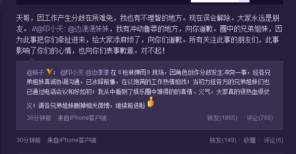 邊瀟瀟微博:“天哥,因工作產生分歧在所難免,我也有不理智的地方。現在誤會解除。大家永遠是朋友。 ”