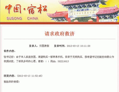 核心提示:昨日上午,一網友給宿松縣委書記寫信稱,希望大家捐款給他買一部蘋果手機,并得到書記的幽默回復,引來無數網友圍觀。眾人驚呼寫信者“太有才了!” 為了買一臺iPad,有人不惜“傾家蕩產”,這種事不管你信不信,去年發生了;為了買一部iPhone,有人向縣委書記求助,這種事不管你信不信,昨天發生了。昨日上午,一網友給宿松縣委書記寫信稱,希望大家捐款給他買一部蘋果手機,并得到書記的幽默回復,引來無數網友圍觀。眾人驚呼寫信者“太有才了!” 雷人“求助信”驚現書記信箱 “張書記好!由于本人家庭貧困,渴望購買一部蘋果手機,但苦于無錢購買,很希望書記您能發動群眾為我捐點款,了卻我多年的心愿,謝謝。”昨天上午10時11分,一封題為“請求政府救濟”的“求助信”出現在宿松縣縣委書記信箱,內容讓人忍俊不禁。 隨后,這封“求助信”被網友轉到了宿松當地的一家論壇上,立刻在網絡上掀起軒然大波。昨天,記者在該書記信箱里看到了這封雷人的“求助信”。寫信網友名叫“窮困潦倒”,更有意思的是,他還在信的最后留下了自己的QQ號碼,希望有人能跟他聯系。 有人夸他有才,有人說是惡搞 “求助信”一出,便引來無數網友的圍觀。 “見過雷人的,沒見過這么雷人的。”網友“飛翔ing”說,這人怎么好意思跟書記開這口啊? “這哥們太有勇氣了,太有才了!”網友“天賦異稟”說。更多的網友則認為,這可能是網友在惡搞。“書記信箱是聯系百姓與領導的重要紐帶,也是公共資源。”網友“我是誰”認為,這樣的惡搞是在浪費公共資源。 昨日下午,記者根據信中留下的QQ號加了對方為好友。QQ資料顯示其是湖北黃岡人,記者多次留言,但是因為對方一直不在線,而沒有得到任何回應。 這樣回復是為讓他自強自立 昨日上午11時52分,“窮困潦倒”的信得到了書記信箱的回復,內容只有一句話:挺起你的脊梁!有網友稱,書記的回復很藝術。昨日下午,記者與宿松縣委宣傳部相關負責人取得聯系。“這封信我們看到了,覺得這個寫信人很有意思。”該負責人說,信是縣委書記親自回復的,書記的意思是讓他自強自立,用自己的努力換回想要的東西。“如果他缺少生產資料或者生活必需品,政府都會盡全力幫他解決。但他要的蘋果手機是消費品甚至是奢侈品,只有靠他自己勞動掙得。” 不過這位負責人也表示,書記信箱是對外公開的,不排除“求助”有惡搞之嫌。 |
