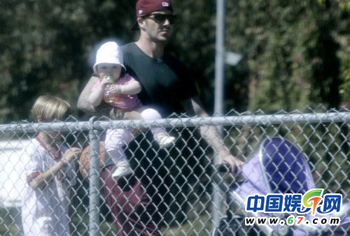 貝克漢姆一家三口上周末現身加州布倫特伍德街頭,他一身休閑打扮單手抱著寶貝女兒。小七一臉幸福模樣喝著奶瓶內果汁,哥哥羅蜜歐則獨自走在他們身后,專心把玩籃球。