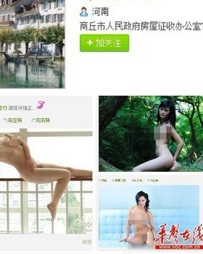近日,認證為“商丘市人民政府房屋征收辦公室官方微博”的微博賬號“商丘房屋征收”因發布大量人體藝術裸照,引來眾多網友質疑。網絡截圖 ????“政府機構微博應該披露政務信息,怎么天天發裸照?”近日,認證為“商丘市人民政府房屋征收辦公室官方微博”的微博賬號“商丘房屋征收”因發布大量人體藝術裸照,引來眾多網友質疑。 ????3月14日,商丘市人民政府房屋征收辦公室接受華聲在線記者采訪時表示,該辦公室從未開通任何官方微博,網上發布大量裸照的微博與其無關。但記者了解到,該微博加V程序完全正常,這意味著微博“商丘房屋征收”一直由商丘市人民政府房屋征收辦公室管理。網站內部人員稱,該賬號近期被盜,裸照事件可能由此引起。 事件:政府機構認證微博出現大量裸照 3月13日,記者奉波在其認證微博發布了一張“商丘房屋征收”的微博截圖,引來眾多網友熱議。 這張截圖顯示,認證為“商丘市人民政府房屋征收辦公室官方微博”的微博賬號“商丘房屋征收”發布了一張年輕女子的正面全裸圖,并稱是自己的“棚拍習作”。 在微博賬號“商丘房屋征收”的頁面上,網友們發現了更多的裸照,更令人驚奇的是,微博中幾乎沒有政務信息的披露。 對于這種情形,部分網友認為,管理微博的這個公務員,拿著納稅人的錢不兢兢業業地工作,反倒大張旗鼓地弄些裸照,實屬不該。但有網友認為處罰相關工作人員不太現實,“他們的回應不是臨時工干的,就是微博被盜號了,啥事也不會有”。還有網友認為,這可能是審核不嚴,導致某些人惡搞。 回應: 商丘房屋征收辦公室稱未開微博 3月14日下午,華聲在線記者輾轉聯系到商丘市住建局房屋征收辦公室。一位李姓工作人員表示,該辦公室從未開通任何官方微博,網上發布大量裸照的微博可能是外人惡搞,與商丘市房屋征收辦公室無關。 可能系微博賬號被盜 隨后,華聲在線記者就此事采訪了微博管理人員。一位工作人員詳細了解相關情況后回復稱,“商丘房屋征收”這個微博賬號加V是按照正常手續辦理的,沒有任何問題。 這名工作人員表示,“經過調查之后發現該賬號近期被盜,裸照事件可能由此引起。” 進展:微博兩度改名 發現有網友指責其發布裸照后,微博“商丘房屋征收”管理員迅速刪除了所有與裸照相關的圖片。 3月14日下午,微博賬號“商丘房屋征收”被改名為“如何是可”,并取消加V認證。在“一句話介紹”一欄,也由“商丘市人民政府房屋征收辦公室官方微博”改為“本微博被盜號”。14日18時許,微博賬號“如何是可”被改名為“啦喲測工”。 |