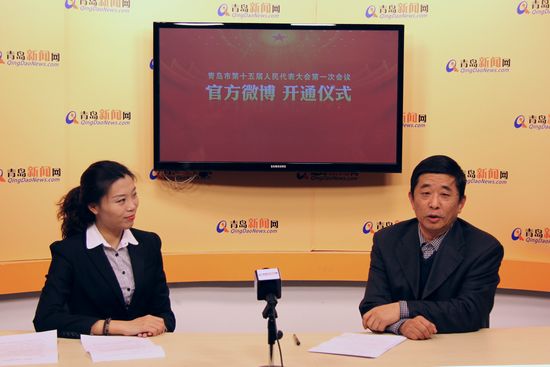青島市人大常委會副秘書長陳維民(右)接受記者采訪