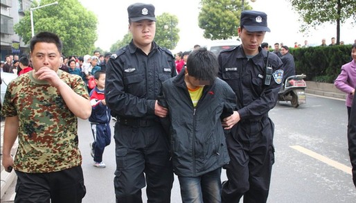 2012年4月13日晚,衡陽縣西渡鎮(zhèn)突發(fā)一起特大命案,一名12歲的小男孩用水果刀將姑媽一家三口殺害。經(jīng)進(jìn)一步偵查,于14日上午9時(shí)30分將肖某抓獲,當(dāng)場從其身上搜出其姑姑家房門鑰匙、手機(jī)及2000元現(xiàn)金等物。犯罪嫌疑人肖某對(duì)殺死其姑姑及表弟表妹的事實(shí)供認(rèn)不諱。圖為犯罪嫌疑人被抓捕歸案。