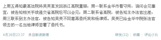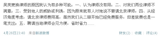 ????4月26日23點37分,吳英辯護律師表示在幾次聯系會見吳英未果后,被吳英案主辦法官告知吳英已更換律師。隨后,張雁峰又發布微博分析了其中的原因,他表示從二審起就免費為吳英提供辯護,更換律師的原因或是受到他人的威脅或利誘。其博文截圖如下: