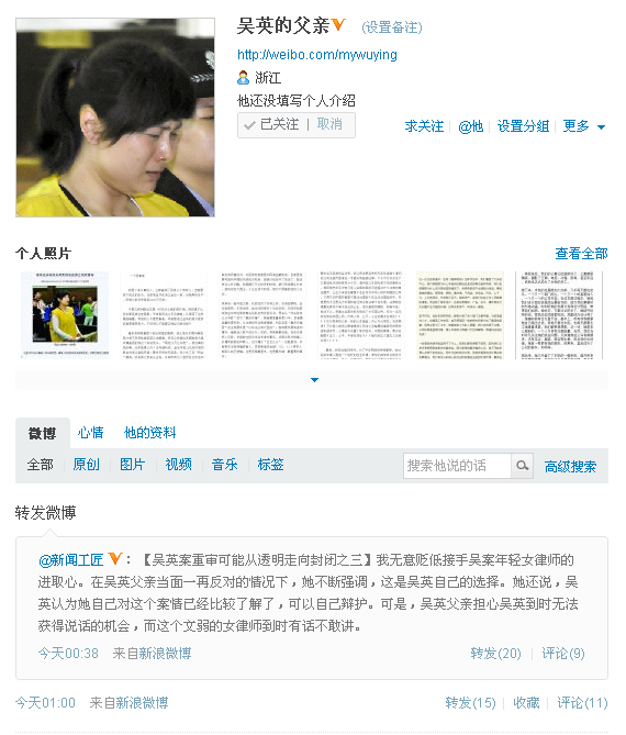 ????吳英父親吳永正轉發了這三條微博。這是其上周五以來首次在微博上發聲。