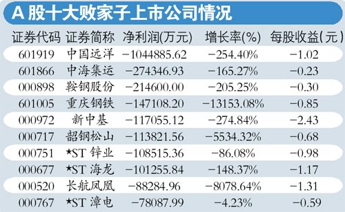 大型企業(yè)巨頭成為去年A股整體業(yè)績持續(xù)增長的中流砥柱,但部分央企巨頭也成為市場的最大拖累。其中中國遠洋和中海集運成為最大的敗家子,年度虧損額分別達到104.49億元和27.43億元。另外,鞍鋼股份、重慶鋼鐵、韶鋼松山等鋼鐵企業(yè)集體虧損。而中國西電上市第二份正式年報就出現(xiàn)5.18億元的虧空。