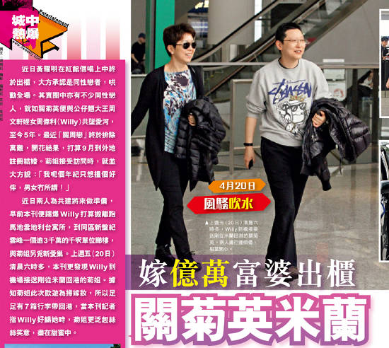 近日兩人為共建將來做準備,早前本刊踢爆周偉利打算搬離跑馬地云地利臺寓所,到同區新樓盤一個逾3千萬的千尺單位看樓,與關菊英另覓新愛巢。4月20日清晨六時多,本刊更發現周偉利到機場接送剛從米蘭回港的關菊英,據知,她這次歐洲游為掃嫁妝,所以足足有7箱行李帶回港,當記者指周偉利好疼她時,關菊英更泛起絲絲笑意,盡在甜蜜中。