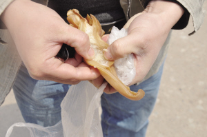 劉先生說著將裝著豬耳朵的袋子打開,一股類似化肥的刺鼻味道沖了出來,讓人作嘔。“我懷疑這是用明膠和塑料做成的,以前在電視上看過類似的報道。”記者了解到,銷售這種豬耳朵的攤販經常是一個星期來一次,即使來了也是六七點鐘到,工商部門上班前離開。