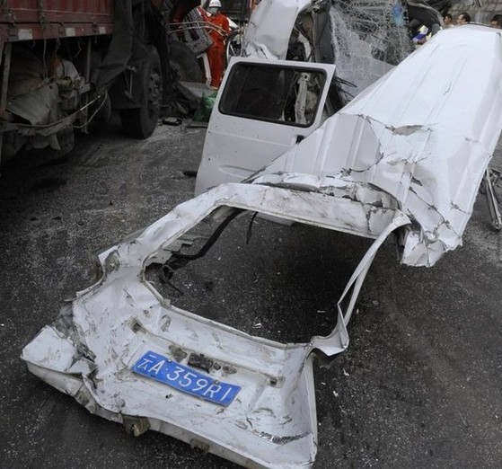 2012年5月5日16時多,汕昆高速云南宜良段發生2起交通事故,造成12人死亡19人受傷。事故詳情正在進一步了解中。據云南高速公路交巡警支隊副支隊長李忠海介紹,兩起交通事故發生時間相隔10多分鐘,地點相距約125米。第一起事故發生在16時03分,汕昆高速云南宜良段KM2068+365M處,一輛江西牌照的大貨車與一輛微型車追尾,造成3人死亡2人受傷;第二起事故發生在16時17分,汕昆高速云南宜良段KM2068+490M處,一輛廣西牌照的大貨車與前面10輛車相撞,造成9人死亡17人受傷。事故發生后,公安交警等部門第一時間趕到現場處置,傷者已經送到醫院救治,事故原因等情況正在調查了解中。圖為被撞解體的微型車。