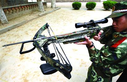 在訓(xùn)練營展出的五類配套裝備中,記者注意到還有一種重達(dá)7公斤的強(qiáng)力弓弩。一位屈膝半跪的戰(zhàn)士穩(wěn)穩(wěn)發(fā)射,“嗖”的一聲,弩就準(zhǔn)確扎入靶心。曲林尊中隊(duì)長告訴記者,弓弩在發(fā)射時(shí)聲音不大,在執(zhí)行任務(wù)時(shí)用途較廣。