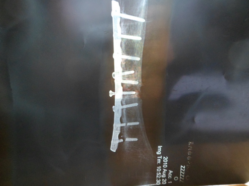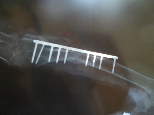 鋼釘明顯打在骨縫里,且斷裂兩顆 二次手術后基本愈合
