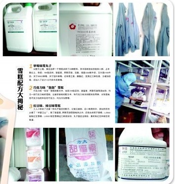 個側(cè)門,進去之后記者看到幾排架子,架子上擺放的幾乎全是香精、色素、添加劑等,包括LJ3355牛奶香精 、香蕉香精 、LJ3364香草淇淋香精 、特純牛奶香精 、復(fù)合食品添加劑 、胭脂紅著色劑、日落黃著色劑 、莧菜紅著色劑等。 ????B 配方揭秘 一粒豆沒有,調(diào)出紅豆、綠豆味 ????草莓味主要靠兩種草莓香精 ????工廠目前主要生產(chǎn)三個品種的雪糕,除了老冰棍、“泡泡”雪糕,還有一種雪丸子也是主打產(chǎn)品。臥底兩天后,5月11日晚上,記者終于見到了晨晨食品有限公司所生產(chǎn)的兩種雪糕的配方。 ????5月11日晚,記者見到了草莓味雪丸子的配方。從配方上可以看到,做出這樣一個雪糕一共用20種配料,其中各種添加劑就有11種,占到半數(shù)以上。包括704穩(wěn)定劑、甜蜜素、阿斯巴甜、乳酸、綠晶3355鮮牛奶、艾爾森2106牛奶,天寧30602草莓、天寧掛葉草莓;三種色素包括香蘭素、胭脂紅、莧菜紅。 ????記者注意到,在配方中,雖然2噸的投料數(shù)量中加入了25公斤的全脂奶粉,但是為了增加奶味,還加入了總計1公斤的牛奶香精。而草莓味的雪丸子雪糕里跟草莓有關(guān)的只有天寧30602草莓、天寧掛葉草莓這兩種草莓香精 ,在2噸的投料數(shù)量中,這兩種草莓香精只有2200克。 ????記者還拿到了另一種雪糕——巧克力味“泡泡”雪糕的配方。情況和草莓味雪丸子類似,這種雪糕也是各種色素、香精等唱主角,例如704穩(wěn)定劑、甜蜜素、阿斯巴甜等。作為一款巧克力味的雪糕,和巧克力有關(guān)的配料僅有兩種,是味佳巧克力怡奶和名花巧克力,均為冷加香精。并且,在2噸的投料數(shù)量中,味佳巧克力怡奶和名花巧克力的投料數(shù)量加起來僅有1800克,也就是說,用占雪糕料的總比例還不到千分之一的巧克力香精,就造出了2噸巧克力味的雪糕。 ????紅豆、綠豆味也是香精調(diào)的 ????5月11日下午,生產(chǎn)經(jīng)理讓記者跟著工人小張,一起去蒸面車間干活,蒸面車間正好在配料室的隔壁。工人小張說,蒸出來的面是做雪丸子用的,是公司所生產(chǎn)的“雪蓮”雪糕的一種。小張給了記者一份丸子面皮的配方,記者注意到,11種用料中,添加劑仍占據(jù)“半壁江山”,除了甜蜜素、阿斯巴甜等甜味劑之外,還有白米粽子香精 、LJ3555秘制紅豆香精、LJ3567綠豆香精這三種添加劑。 ????把所有調(diào)料領(lǐng)完之后,小張開始教記者配料。“咱們做一鍋丸子面皮,用多少料都得按配方來。”說完小張拿出幾個紙杯,放在秤上,打開了秘制紅豆香精的瓶蓋,“紅豆香精倒28克,綠豆香精4克,白米粽子香精32克。”香精瓶蓋一打開,記者立刻聞到濃郁的紅豆和綠豆的氣味。這幾種香精的總重約60克,稱好后,小張將其倒入一大桶水中,攪拌了一下,隨后倒入鍋里蒸面。 ????等到丸子面皮出鍋后,記者仔細(xì)聞了聞,面上還真的有紅豆和綠豆的味道。然而在配料中,記者只看到了兩種香精,沒有紅豆,沒有綠豆。 ????神秘添加劑工人諱莫如深 ????配料之前,記者要跟隨工人小張去庫房領(lǐng)需要的所有原料。庫房的“管家”姓李,小張交給了李師傅一個出庫單,上面寫著丸子面皮的配方表上所寫的11種用料。過了20分鐘左右,李師傅把所有原料配齊。隨后,他神神秘秘地交給小張一個編織袋,“這是另外一種果子粉,你先拿去用。” ????記者注意到,這包“果子粉”袋口已經(jīng)打開,分量不多,僅有半袋。袋子上歪歪扭扭地寫著麻薯淀粉幾個字。這究竟是什么東西?為什么不在配方和出庫單上注明?記者追問,但李師傅不愿多說。 ????回到蒸面車間后,小張開始教記者調(diào)配丸子面皮所需要的料。果子粉是最主要的用料,配方上寫著要加入5公斤。但小張告訴記者,果子粉只加4.5公斤就行,之后再加上0.5公斤這種神秘的“果子粉”。這又是為啥?小張卻支支吾吾說他也不知道。 ????于是,記者就按照小張的吩咐來配料,從手感上,這種“神秘果子粉”較之普通的果子粉要更粗一些。剛干了一會,記者竟然從這袋神秘的配料中拿出了幾塊大石頭,沾滿了面。小張拿著去找李師傅重新?lián)Q了一袋。趁小張不注意,記者掀開了塑料膜,發(fā)現(xiàn)編織袋上寫著“變性淀粉”,是臨沂一家工廠生產(chǎn)的,袋上寫著“食品添加劑”。之后,記者向小張問及有關(guān)“變性淀粉”的事情時,小張卻仍然諱莫如深。 ????C 工作狀態(tài) ????從早7點一直忙到晚11點 ????喝水多就得上廁所,太麻煩了,一直喝得少,習(xí)慣了,就感覺不到渴了。咱們這兒都是流水線,你這邊走了,去上廁所了,前邊的貨到你這兒就得積壓,后邊的人也沒法干活。 ????——工人小麗(化名) ????記者在晨晨食品有限公司暗訪期間,根據(jù)生產(chǎn)經(jīng)理的安排,從早晨7點上班,一直到晚上7點才能下班,中間只有約半小時的午飯時間,基本上吃完飯就要一刻不停地干活。 ????暗訪的第一天,記者從事的是分裝“泡泡”雪糕的工作,除了上廁所和吃飯時間,一直在站著工作,等到晚上下班時,兩腿就跟灌了鉛一樣重。然而,沒想到的是,暗訪第二天,記者工作的強度比第一天還要大。 ????5月11日上午,記者依舊從事“泡泡”雪糕分裝工作,中午,車間的班長張師傅通知記者,下午去蒸面車間干活,記者就跟工人小張成了搭檔。配完料之后,張師傅又通知說,“今天要蒸20鍋面,蒸完才能下班。” ????“今天肯定沒法按時下班了,估計得干到晚上9點左