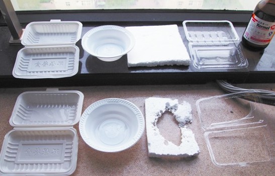 ????隨后,記者又從一處化學器材專賣店買到了“乙酸乙酯”溶劑,是一種無色透明的液體。記者將采購來的PS飯盒、PP飯盒、塑料碗、發(fā)泡塑料等作為實驗對象,看這些飯盒接觸乙酸乙酯溶劑后究竟會發(fā)生什么反應。