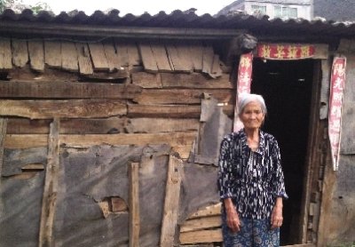 ????巧家縣舊城與新城交會的青年路,一位85歲的老奶奶站在木棚外。