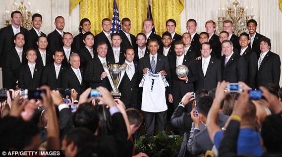 當天,貝克漢姆球隊成員統(tǒng)一西裝革履,紳士范十足。本來為全體球員慶賀,隨后竟成為奧巴馬調(diào)侃貝克漢姆專場。頗具幽默細胞的奧巴馬開玩笑說,37歲貝克漢姆已近中年,慢慢變老,球隊有一半成員都能做他的