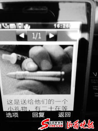 ????2012年4月22日,王強的一條彩信發到了周寶的手機上,這是一顆子彈的照片,下面配有文字:“這是送給他們的一個小禮物……你想想吧。”“你可以選擇報警,但是你會后悔一輩子。”“再忍下去,全家都得遭殃。”周寶的神經接近崩潰,他決定鋌而走險,以犧牲自己換來全家的安寧。他準備好刀錘等工具,讓女兒給王強打電話,約他來大同。