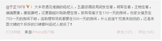 條微博上寫道“大半夜遇見難搞的經(jīng)紀(jì)人,五星級(jí)酒店周潤(rùn)發(fā)住著,胡軍住著,王艷住著,偏偏要搬,搬就搬吧,還要?jiǎng)〗M補(bǔ)貼助理住宿,我和導(dǎo)演才住110一天的房間,你家女演員住750一天的房間不夠,連助理和司機(jī)都要住500一天的房間,什么世道?究竟來拍戲的,還是來耍大牌的?好好的口碑都叫經(jīng)紀(jì)人做沒了!”隨后,于正似乎余怒未消,又連發(fā)了兩條微博,稱“自出道以來,合作過的女星無數(shù),范冰冰董潔林心如楊冪陳喬恩霍思燕都隨劇組住宿,從無特殊化,更別說住著五星級(jí)還抱怨不能養(yǎng)狗,連助理的待遇也要超過導(dǎo)演,實(shí)在欺人太甚,我知道這一寫,明日必定爭(zhēng)議,無論罵聲也好,換演員也好,我都受了,希望適可而止!”